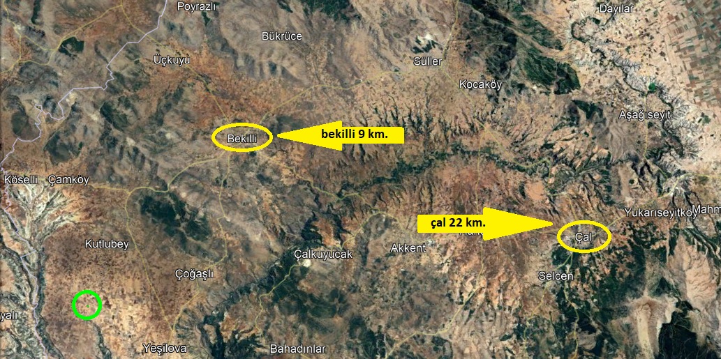 * DEŞDEMİR KÖYÜ 4 km, KUTLUBEY KÖYÜ 2.600 m, BEKİLLİ MERKEZ 9 km, ÇAL MERKEZ 22 km MESAFEDEDİR.